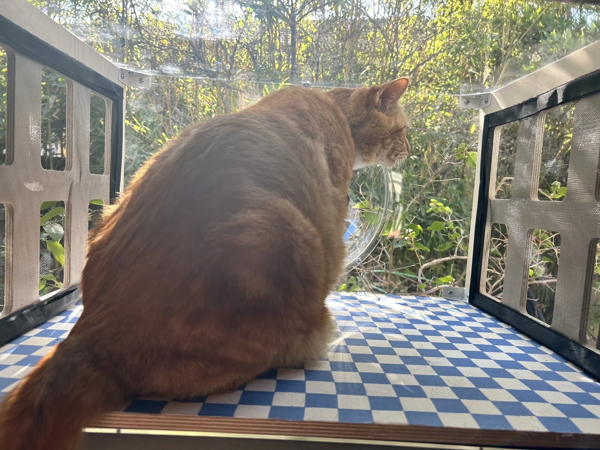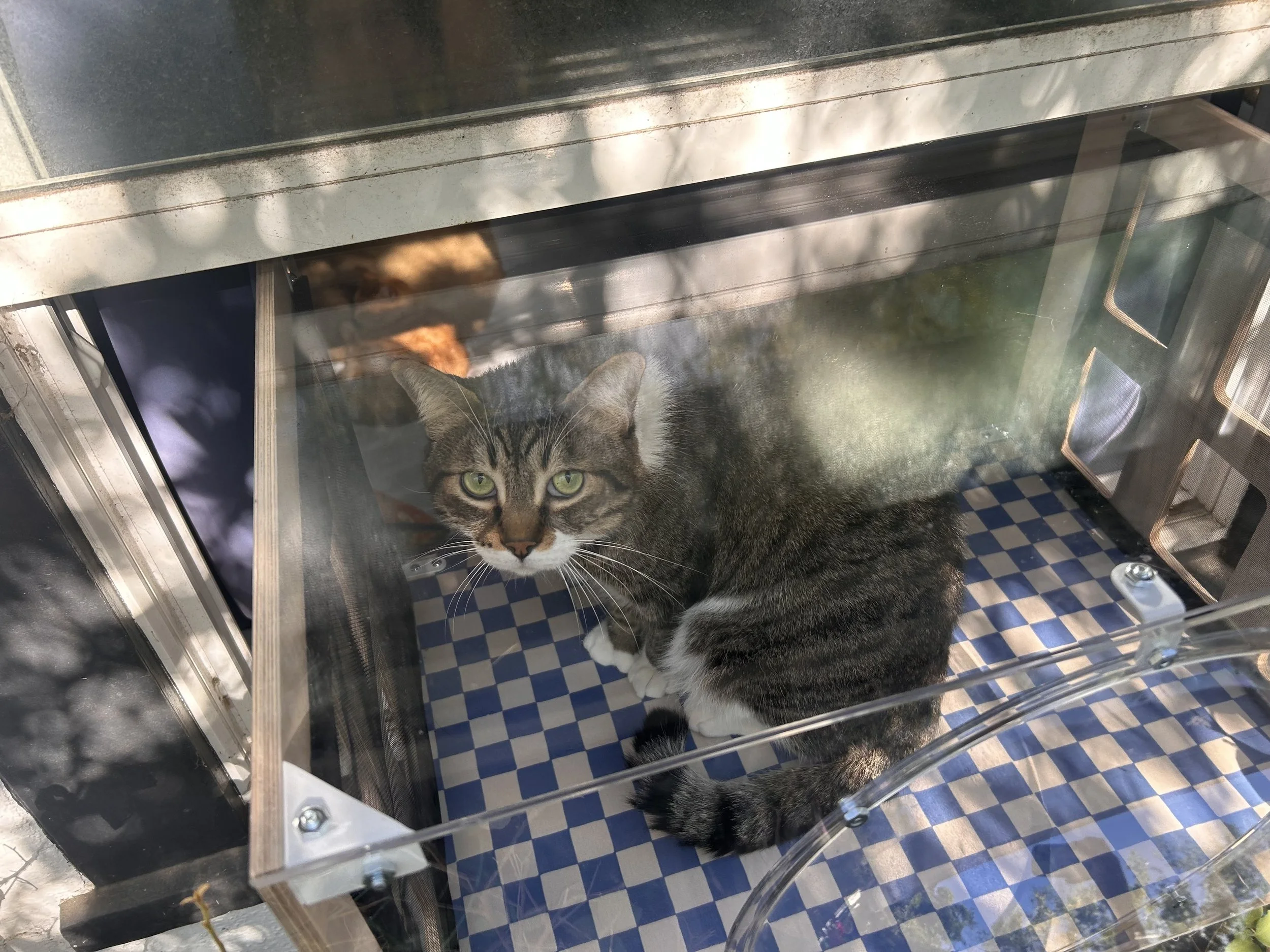 The Purrgola is built with high quality, weatherproof acrylic, which has been load-bearing tested to withstand 100 pounds (though we recommend no more than 50!). Windows are made from stainless steel, scratch-resistent mesh, so you don’t have to worry about even the naughtiest kitties.